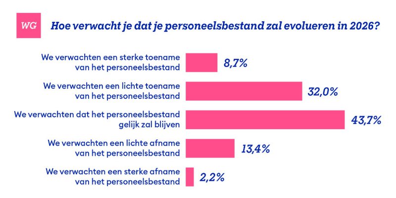 Tegelijk is slechts een beperkte groep ondernemingen van plan om het personeelsbestand af te bouwen. Dat bevestigt dat bedrijven vandaag eerder inzetten op behoud van talent dan op besparingen via ontslagen.
